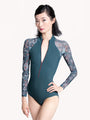 The Eleve Michelle Leotard features a zip-up front, a Lagoon base, and Crescendo Lagoon Mesh long sleeves and exclusive to RTW back panel. This blue green floral print is show stopping!
